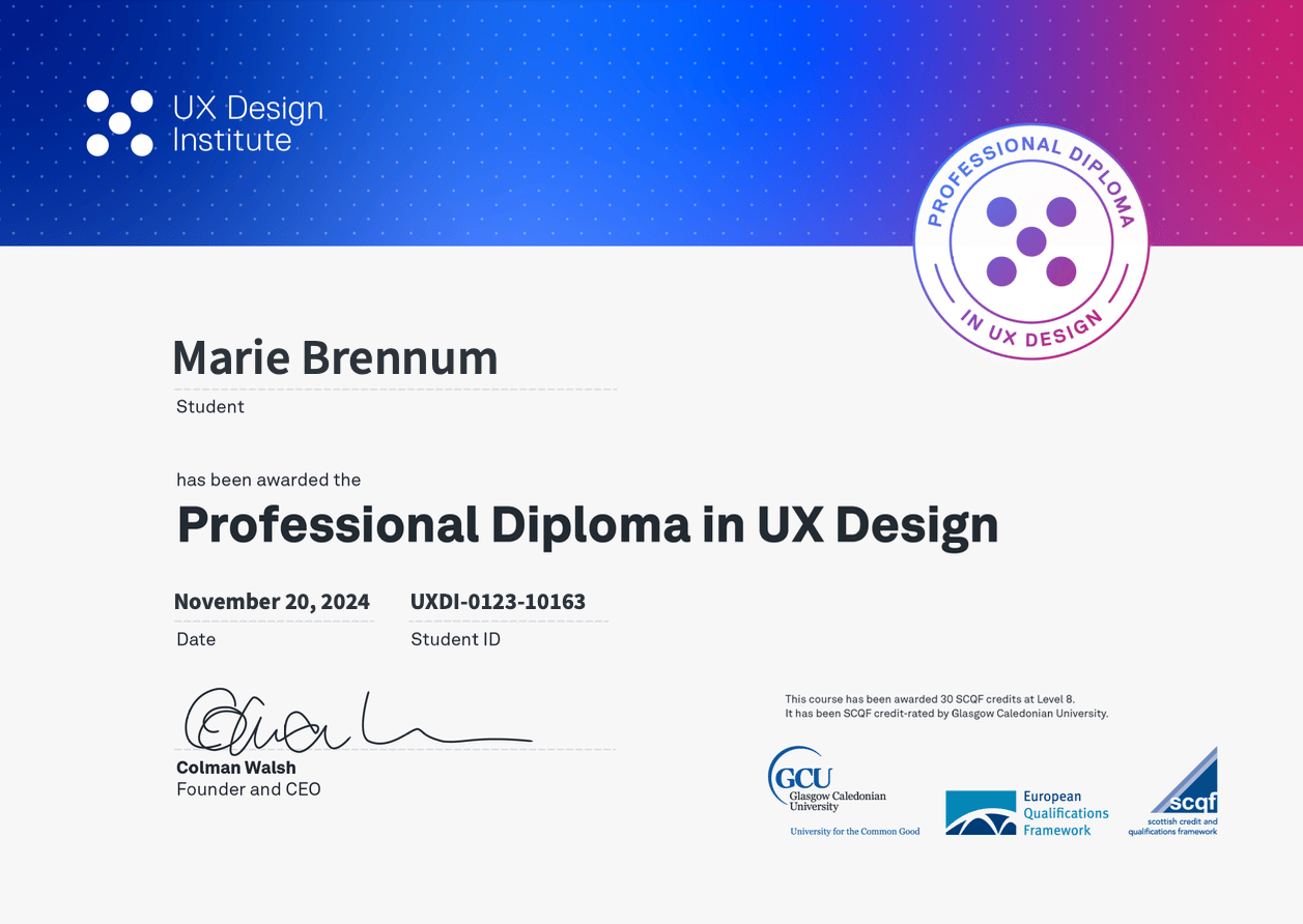 Mellom jobber valgte jeg å fylle på med oppdatert kompetanse innen UX og fullførte Professional Diploma in UX Design ved UX Design Institute, akkreditert av Glasgow Caledonian University. Studiet ga meg en solid forståelse av hele UX-prosessen, fra innsiktsarbeid og interaksjonsdesign til prototyping og brukertesting.